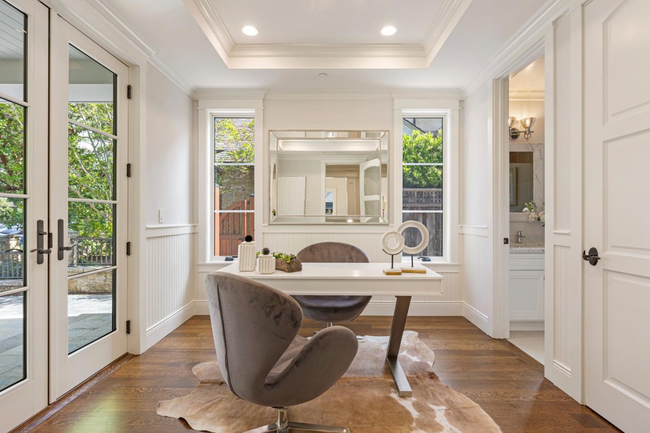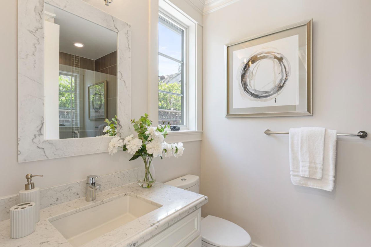 Newly built in 2014, this stunning residence in sought-after Old Palo Alto is unmatched in craftsmanship and design. Spanning three levels, the floor plan yet feels intimate with exceptionally light and bright spaces including folding glass doors in the family room/kitchen that open to the rear grounds for indoor/outdoor living. An impeccable array of details at every turn include natural stone and tile, gorgeous hardwood floors, beadboard wainscot, sconce lighting and fine carpet on the lower level that unify the home. There are 6 spacious bedrooms and 6.5 baths, four of the bedrooms are en suite, two share a bath, and there is an additional bath with sauna. A main-level suite is ideal for a remote work/office with private exterior access. A lower-level recreation room with full bar, cinema room including retractable screen and projector, plus a large custom wine cellar are some of the outstanding spaces of this thoughtful design. Equally impressive are the fully landscaped grounds and wraparound covered rear porch with fireplace, a separate arbor with operable louvered roof, and a vast stretch of lawn. With remarkable beauty and incredible livability in a premier location midway between San Francisco and Silicon Valley this is the ultimate family and executive retreat.